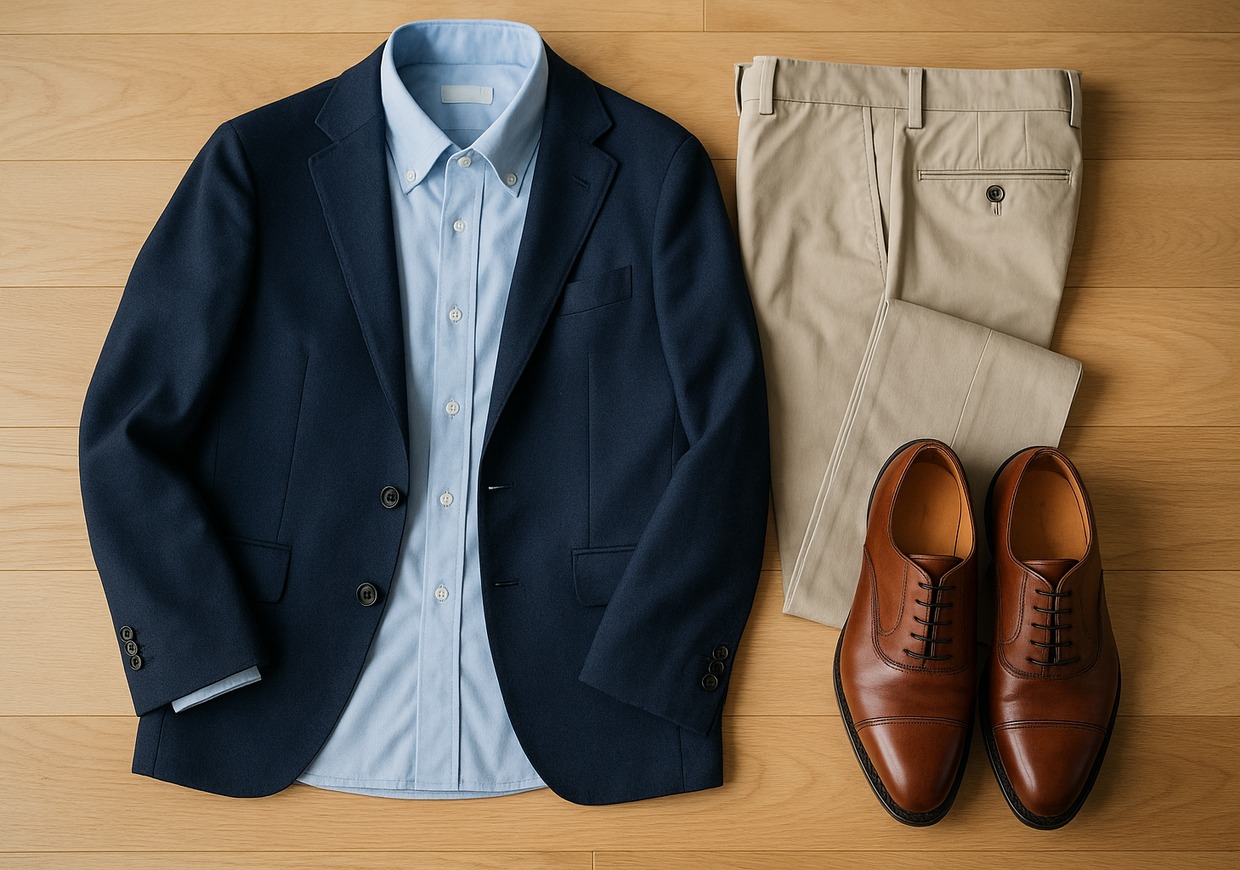 ネイビーのジャケットにグレースラックス、白シャツという基本スタイルには、ダークブラウンのプレーントゥやローファーがよく合います。足元に適度な重厚感を持たせることで、全体が引き締まります。