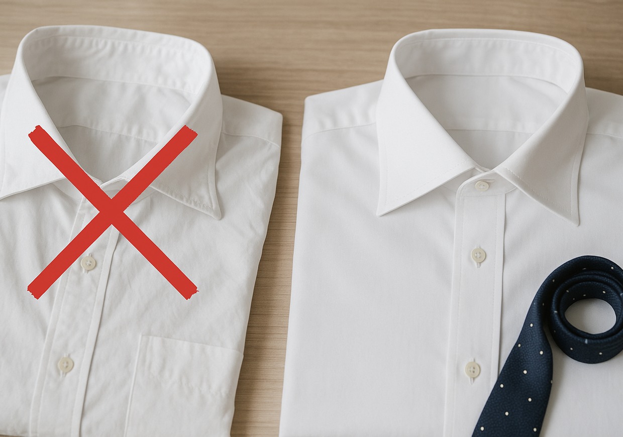首が短いのに高すぎる襟台を選んだり、丸顔で開きすぎの襟型を選ぶとアンバランスになります。顔型・体型とのバランスを事前に確認しましょう。
